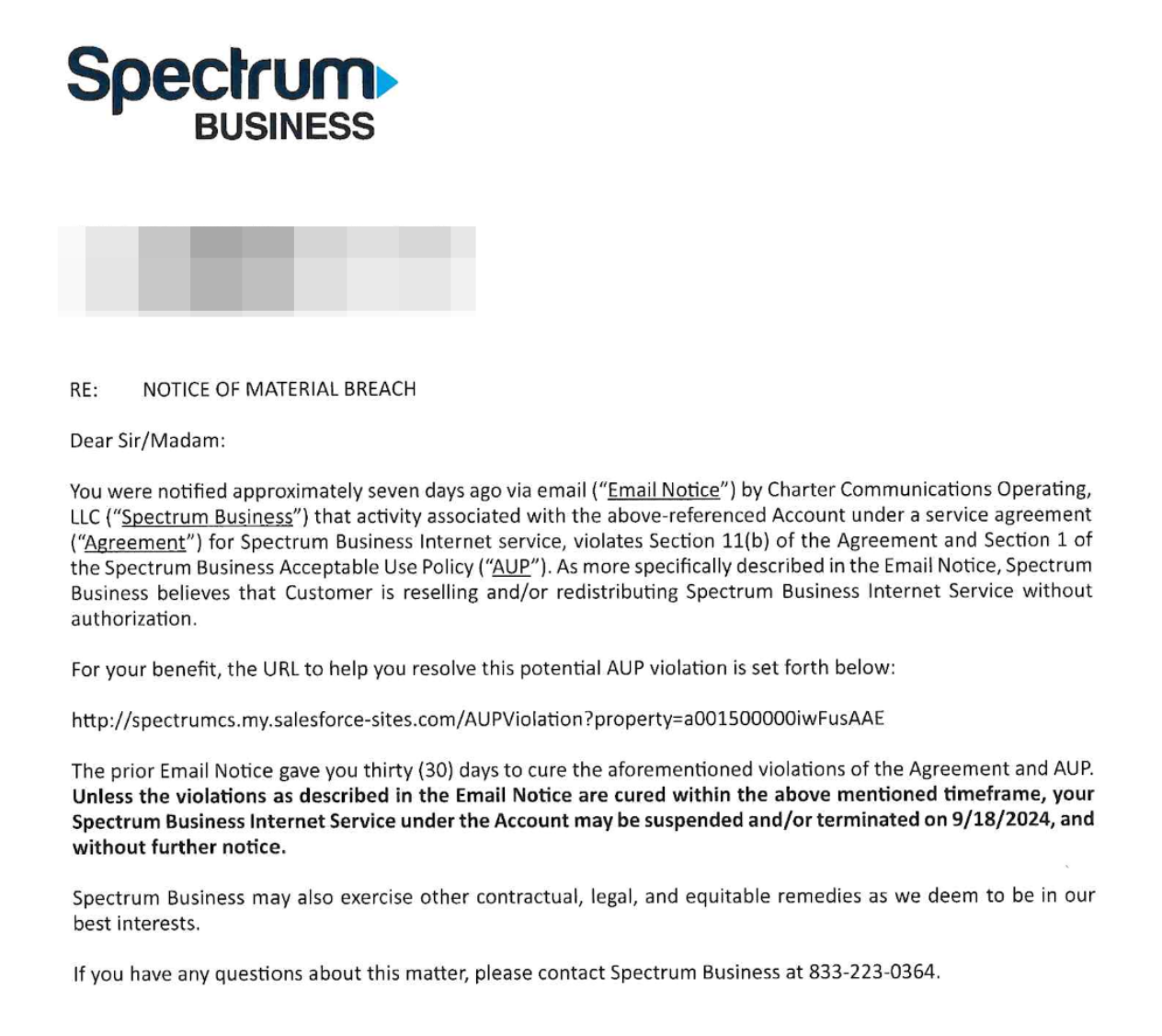 Has your facility recently received a notice or email from Spectrum regarding a potential breach of their Acceptable Use Policy (AUP)? Many facilities are being informed by Spectrum about violations related to residents’ use of Spectrum Business Internet services. The notice typically states that reselling or redistributing internet services within the facility to residents without authorization is a violation of Spectrum’s terms of service (see sample below).